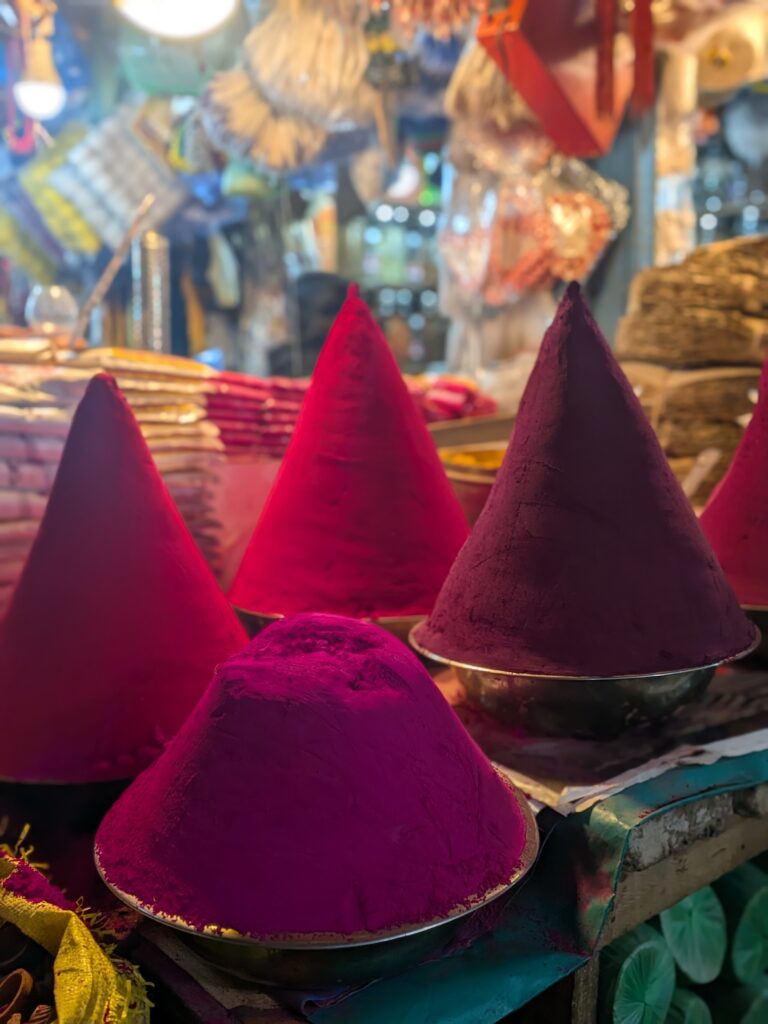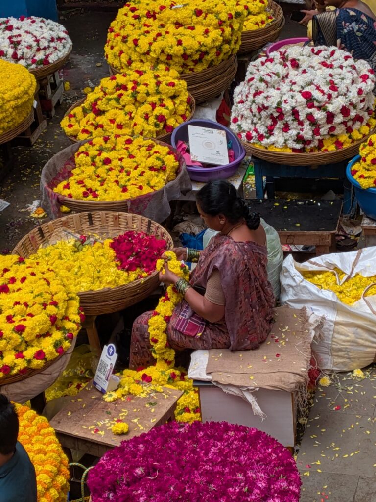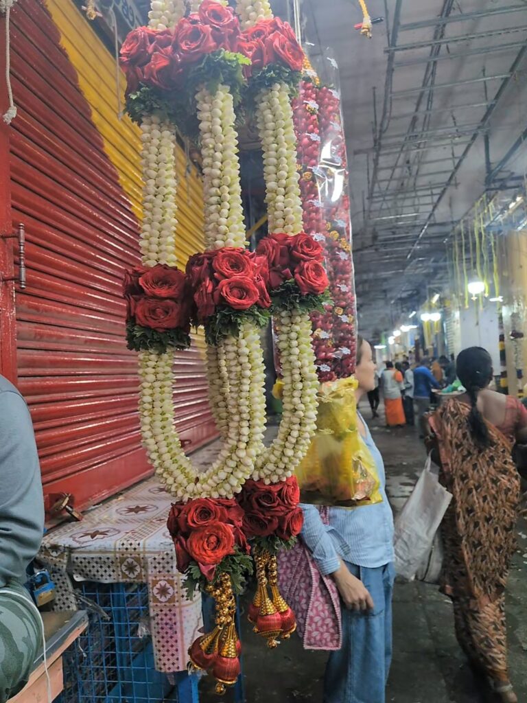 Nous sommes ensuite rentrés dans le marché aux fleurs, c’est un marché couvert, les artisans tissent des guirlandes des fleurs parfois simplement à partir de pétales c’est magnifique.