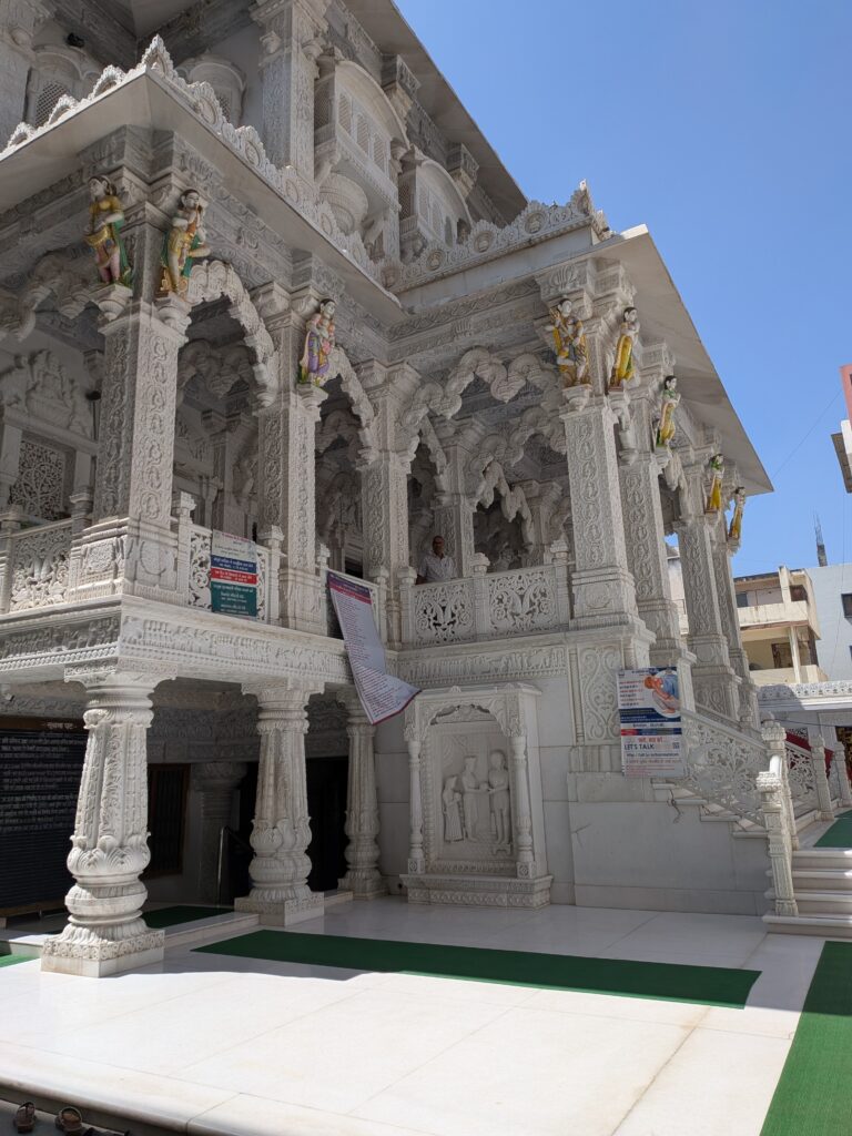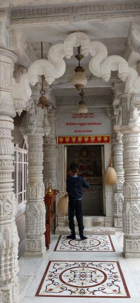 Puis nous sommes ressortis en passant par le marché aux légumes pour aller se promener dans le quartier environnant, nous avons visité un temple puis un temple Jaïn tout en marbre blanc, il y avait même au sol des incrustations de pierres semi précieuses en forme de fleurs, je ne pouvais pas prendre de photos, je n’ai que l’extérieur mais j’ai trouvé une image où vous pourrez apercevoir le sol. Le marbre est taillé comme de la dentelle.