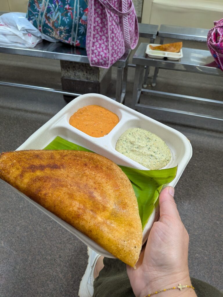 J’ai ensuite mangé mon premier Masala Dosa, un plat typique et que l’on trouve partout à Bangalore, il s’agit d’une d’une crêpe salée fourrée d’un curry de pommes de terre épicé, j’ai adoré :