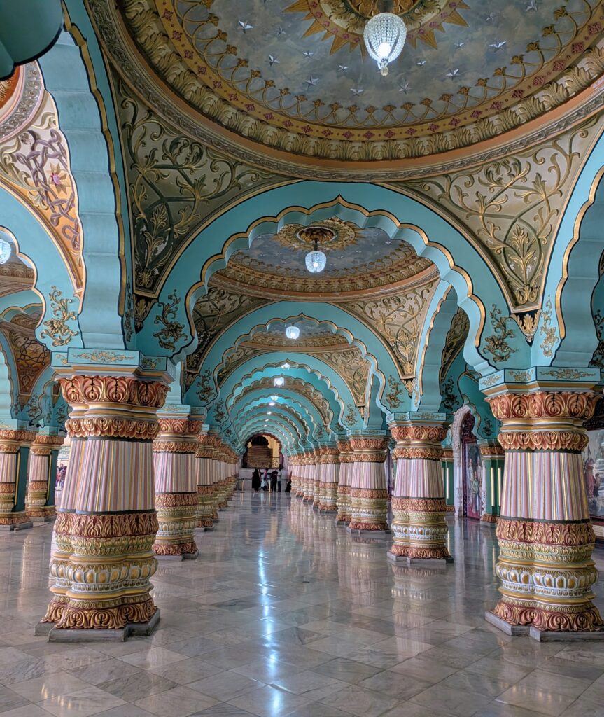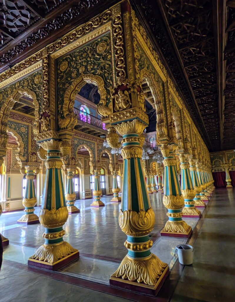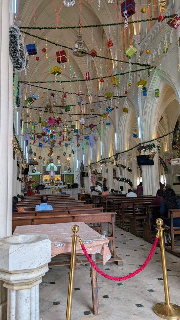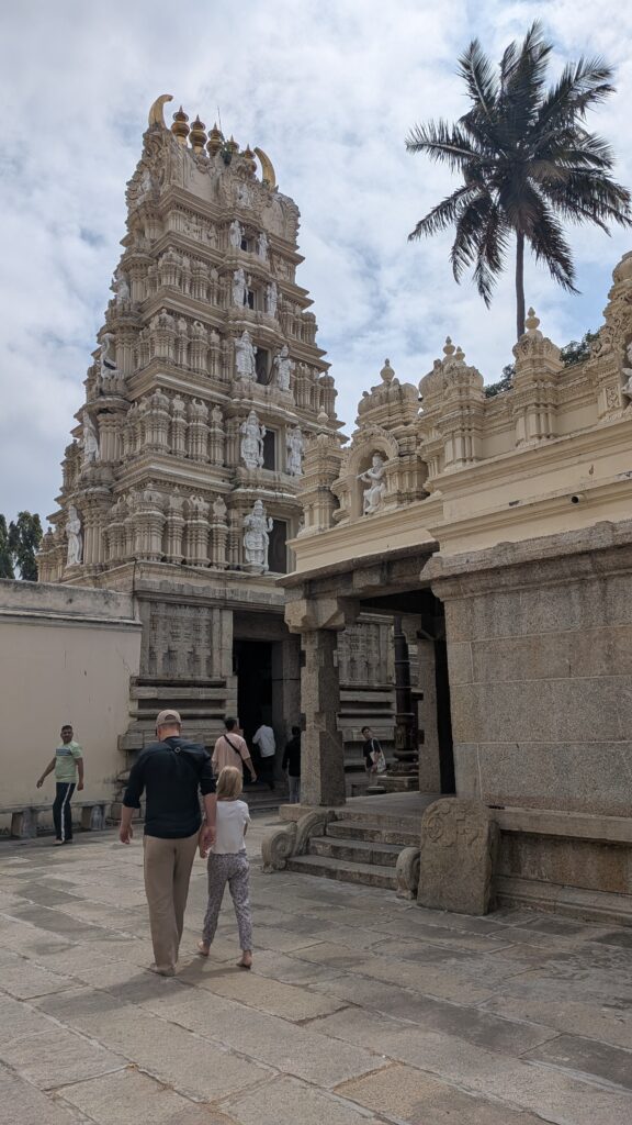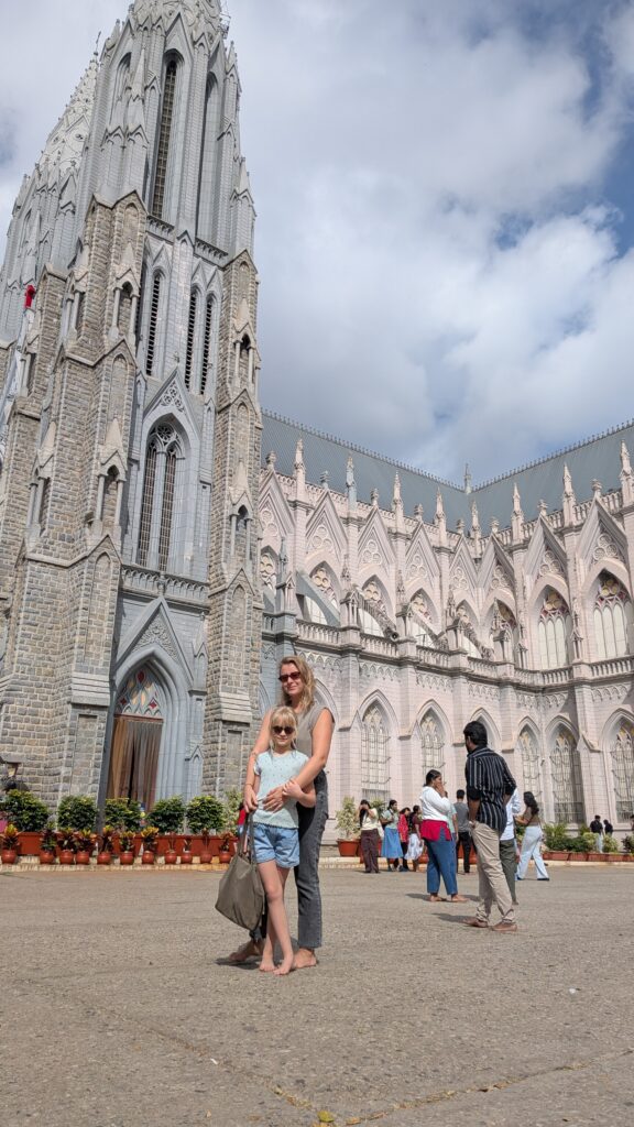 Nous sommes donc partis pour Mysore, une ville à 3h de route. Nous y avons visité le zoo, le Palais, le temple de Chamundeshwari, des Jardins et avons tenté de voir des cascades sur le retour, mais mauvaise période il n’y avait que très peu d’eau ! Mysore est connue pour sa soie et le bois de Santal, nous avons pu admirer un métier à tisser et de belles sculptures mais les prix…. nous n’avons rien rapporté! Nous avons aussi visité notre première cathédrale Indienne…pieds nus! Tout comme la visite du palais, il faut déposer ses chaussures dans un sac à l’entrée.